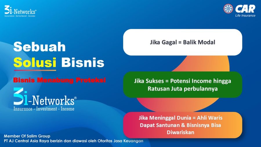 Berpeluang mendapatkan Penghasilan bila menjalankan usaha ini, dengan cara mengajak teman, sahabat, saudara, tetangga untuk bersama-sama bergabung dalam program 3iNetworks. Pebisnis 3iNetworks wajib terdaftar sebagai Agen Berlisensi AAJI & AASI sesuai ketentuan keagenan yang berlaku.