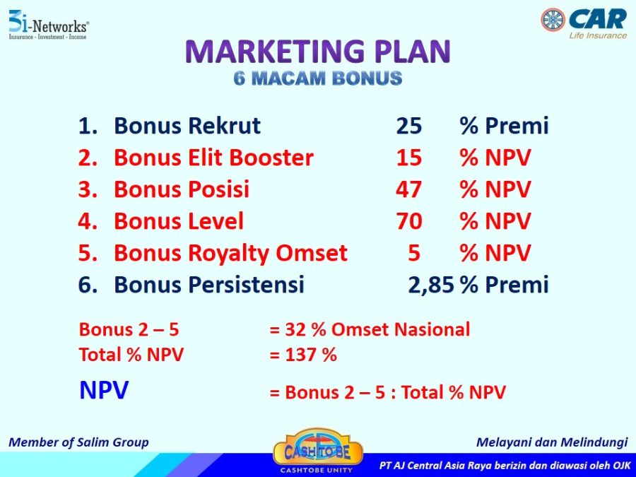 Selain itu akan mendapatkan Bonus Jaringan sesuai pertumbuhan Omset Group yang dihitung selama 1 tahun (tahun pertama) sebesar 32% dari Total Omzet Nasional yang terbagi dalam 4 jenis Bonus (Elit, Posisi, Level, Royalty Omset), di tambah lagi Bonus Persistensi yang akan di terima setiap bulannya pada tahun ke 2 (bulan ke 13 – 24) yang di bagikan secara merata sesuai ketentuan.
