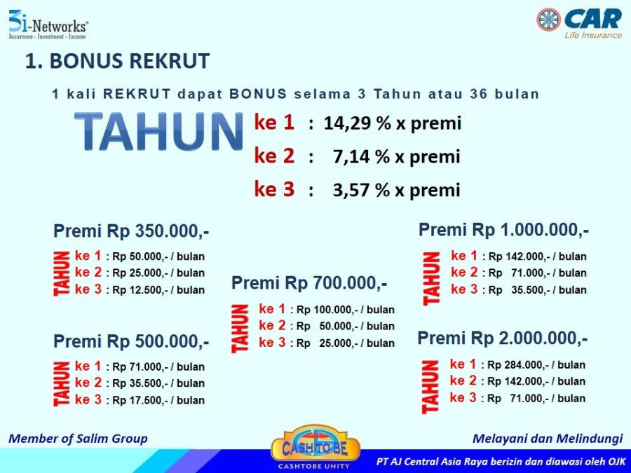 Adalah Bonus Mengajak/Merekrut Nasabah Baru. Sekali merekrut nasabah baru berhak bonus selama 3 tahun (36x) dengan besaran bonus sesuai pilihan premi nasabah baru.