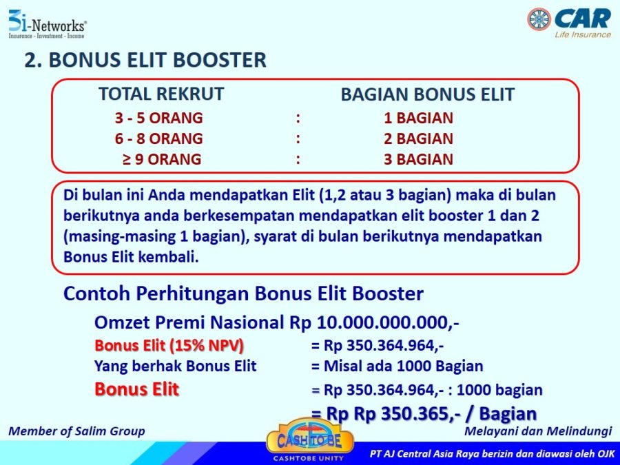Adalah Bonus yang diberikan kepada mitra yang dapat merekrut 3 – 5 orang dalam bulan berjalan maka akan mendapat 1 bagian, jika merekrut 6 – 8 orang dalam bulan berjalan maka akan mendapatkan 2 bagian dan jika merekrut lebih dari 9 orang dalam bulan berjalan maka akan mendapatkan 3 bagian. Besaran Bonus Elite ± Rp 300.000,- per bagian.