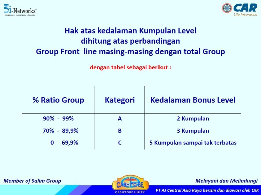 Adalah Bonus Kumpulan dari Omset Group Sistem yang dihitung berdasarkan pengelompokannya, di hitung 5 Kumpulan level setiap kelompoknya. Ada 7 Kelompok perhitungan dimulai kelompok Rp 350.000,- s/d kelompok Rp 30.000.000,- dengan presentase sesuai tabel.