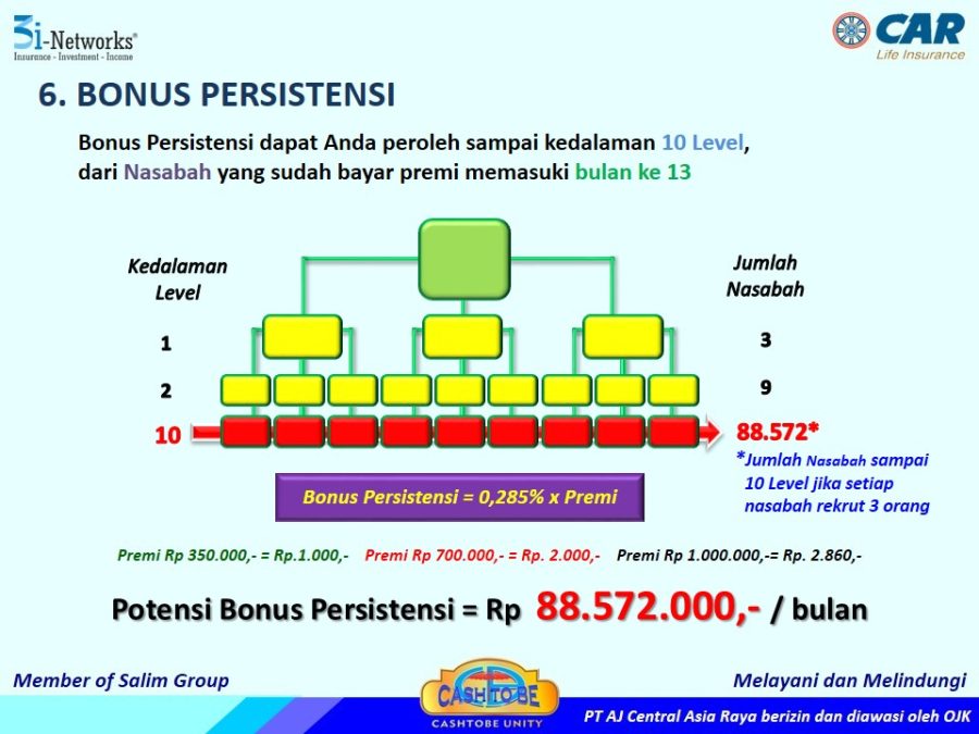 Adalah Bonus tambahan bagi semua mitra yang telah memiliki group / jaringan dengan besaran 0,285% dari premi setiap mitra di jaringan sampai kedalaman 10 level. Bonus ini diberikan setiap bulannya dengan perhitungan dimulai tahun ke 2 atau bulan ke 13 dari premi nasabah yang ada dalam jaringannya. Penerima bonus wajib melakukan pembayaran premi ke 13 up untuk dapat menerima bonus persistensi ini.